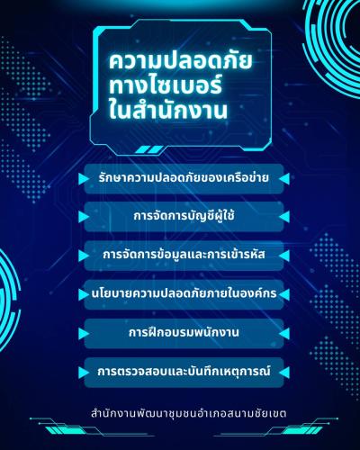 ? พัฒนาชุมชนสนามชัยเขต ให้ความสำคัญเรื่องความปลอดภัยทางไซเบอร์ สำหรับเจ้าหน้าที่ในการใช้เครื่องมือสื่อสาร และอุปกรณ์สำนักงาน จึงขอนำเสนอข้อปฏิบัติที่ควรรู้เพื่อป้องกันความเสียหายของข้อมูล จากภัยคุกคามทางไซเบอร์ ซึ่งบุคลากรที่มีความข้อมูลเพียงพอ ถือเป็นแนวป้องกันด่านแรกในการรับมือกับการโจมตีทางไซเบอร์